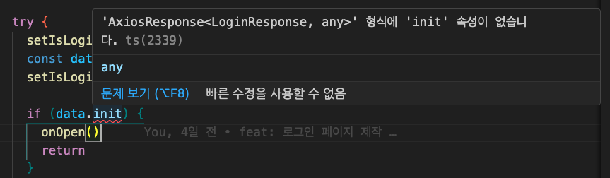 🐞 문제상황axios에서 interceptor를 사용해서 데이터를 바로 리턴해주도록 설정했다. 그런데 axios에서 리턴 받은 데이터 객체의 속성을 바로 사용하려고 하니 타입에러가 발생했다. 그리고 인터셉터를 적용하지 않은 것처럼 data.data.속성명을 작성했더니 타입에러가 뜨지 않았다. // utils/api.tsconst api = axios.create({ baseURL: 'http://baseurl', timeout: 1000 * 30,})api.interceptors.response.use( (response) => { return response.data // 응답으로 받은 response의 data를 리턴값으로 },) 배경지식 1. interceptor인터셉터란?axios..